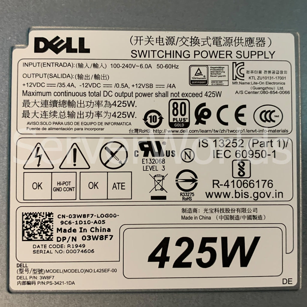 Dell 3W8F7 Precision T5820 425W Power Supply L425EF-00 PS-3421-1DA