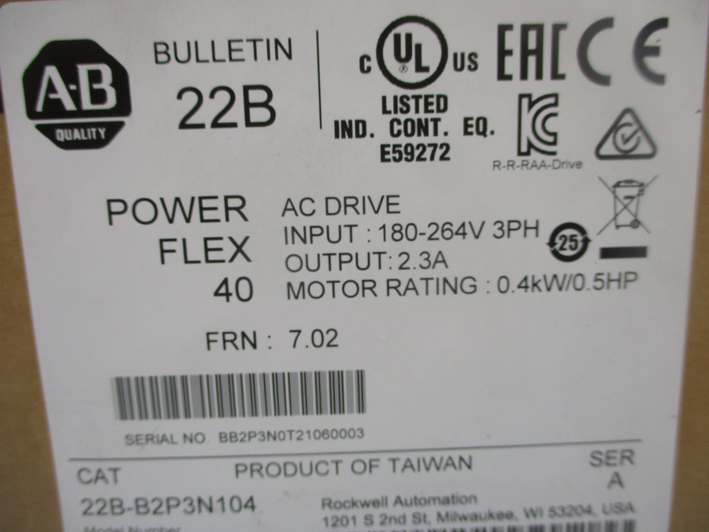 ALLEN BRADLEY 22B-B2P3N104 SER. A 180-264VAC 2.5A F/W 7.02 NSMP